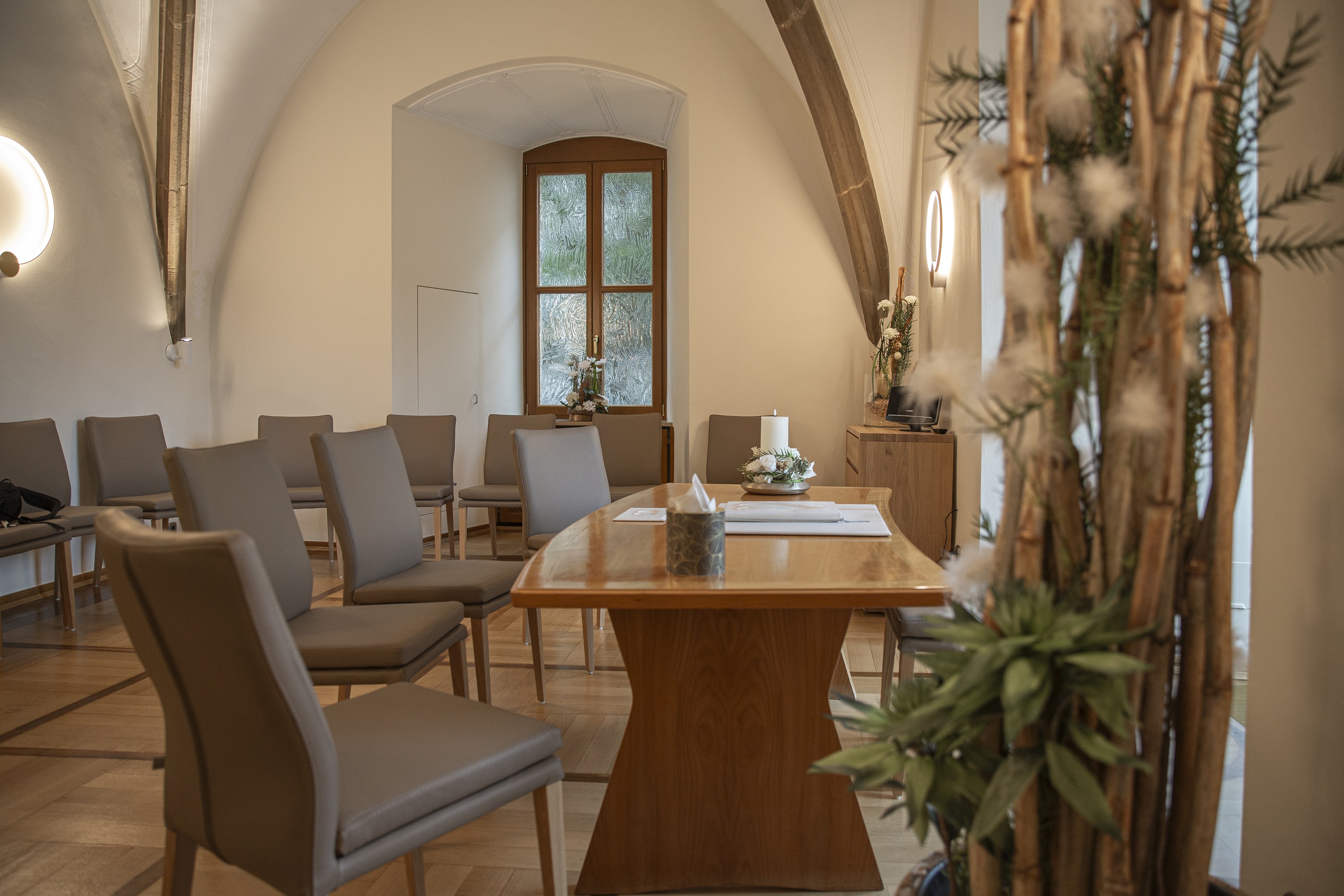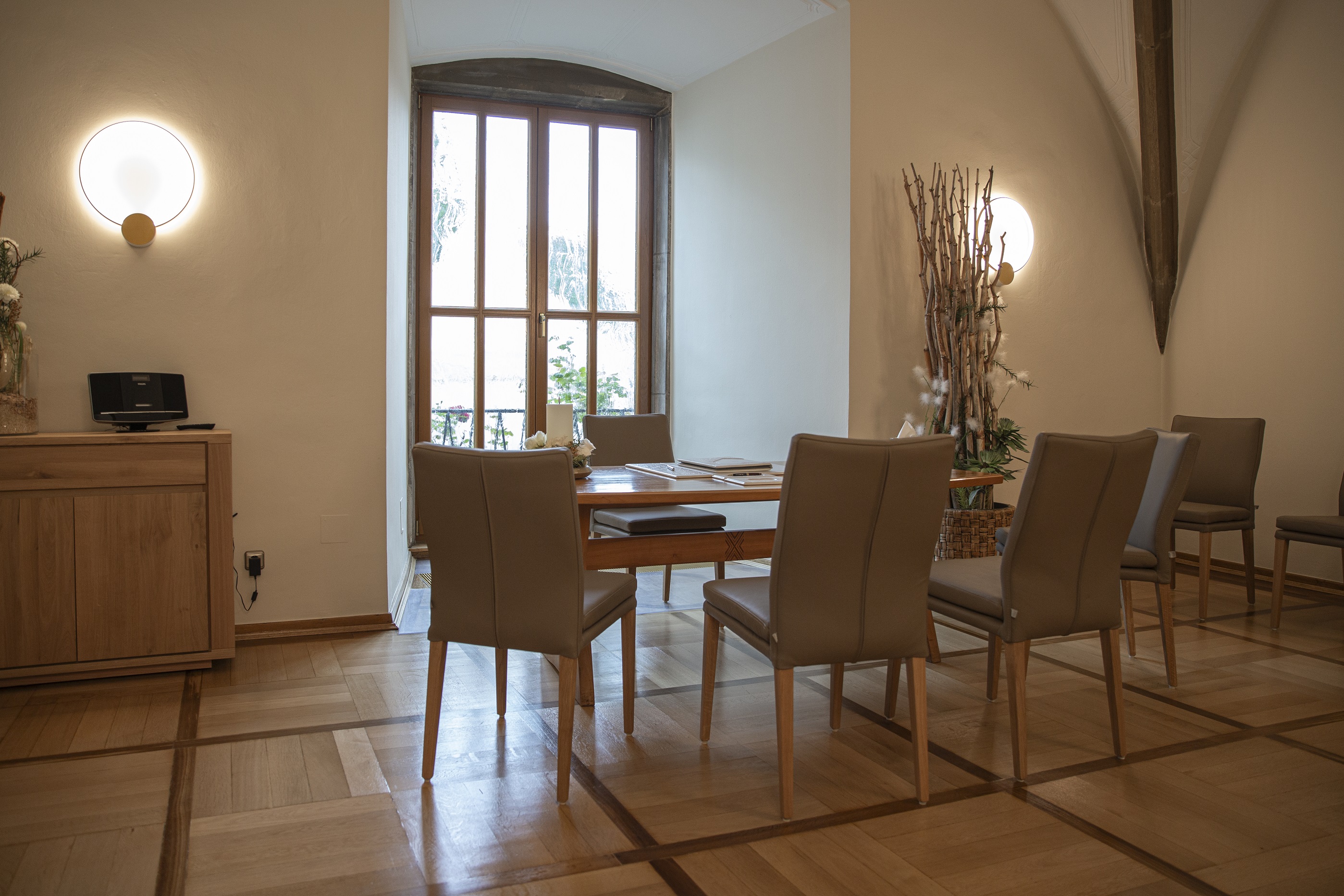 Das Trauzimmer kann an heutiger Stelle auf ein fast 75-jähriges Bestehen zurückblicken. Von vielen Menschen wird es als das schönste Zimmer der Stadtverwaltung empfunden. Ein wuchtiges Kreuzrippengewölbe mit dem Stadtwappen als Abschlussteil in der Mitte, ein Parkettfussboden mit zwei eingelegten Ringen als Symbol für den Raum und ein prächtiger Spiegel sorgen für eine besondere Atmosphäre.
